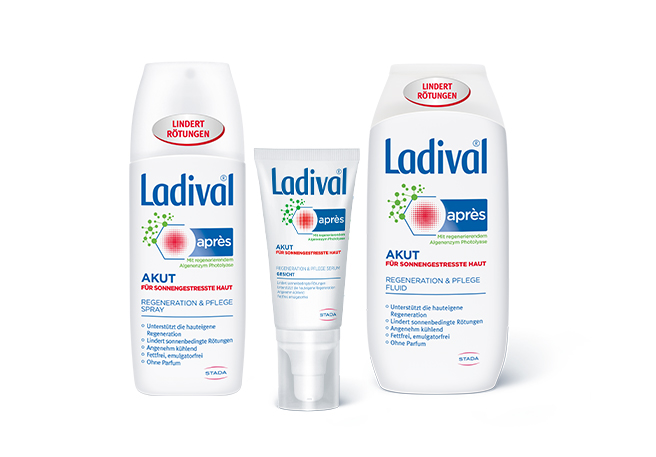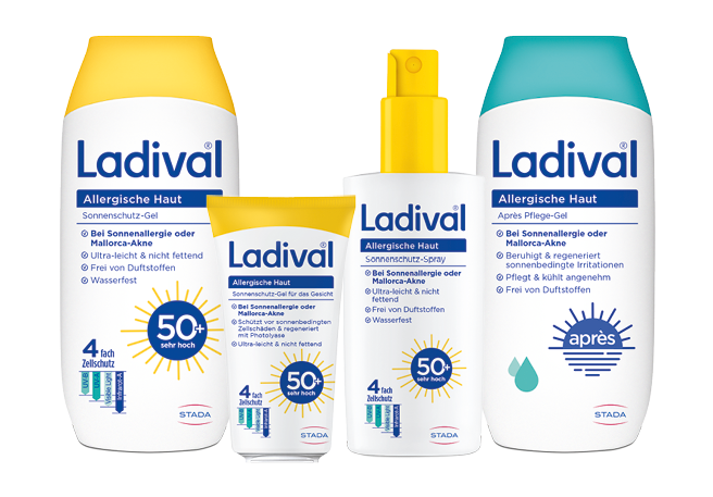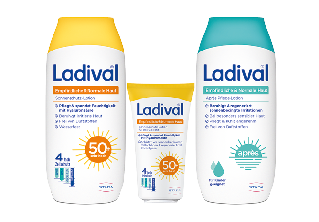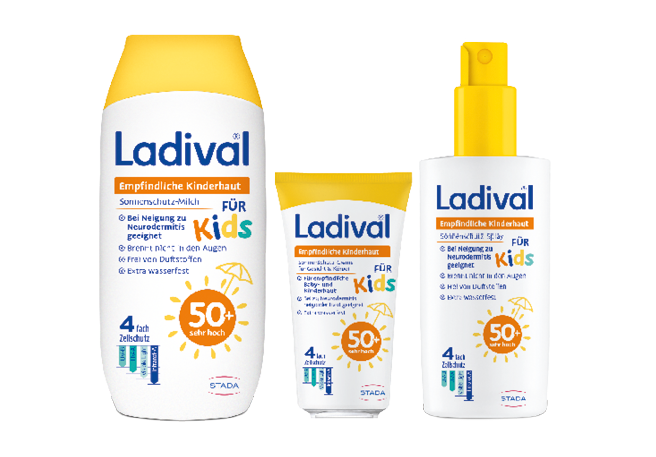 Wohltuende Sonne hat auch ihre Schattenseiten. Intensive UV-Strahlung schädigt die Haut und kann im schlimmsten Fall zu Krebs führen. Ladival® von STADA schützt mit einem einzigartigem Infrarot-A-Schutzkomplex sowie UV-A- und UV-B-Filtern und wirkt damit dreifach: gegen Sonnenbrand, Zellschäden und Hautalterung. Ob allergische, empfindliche, trockene Haut oder Kinderhaut – Ladival® hat für jeden Hauttyp das richtige Produkt und ist exklusiv in Apotheken erhältlich.