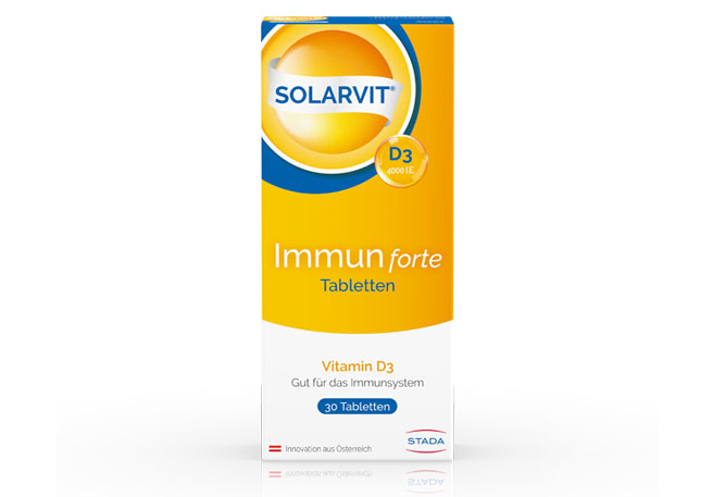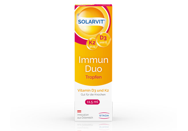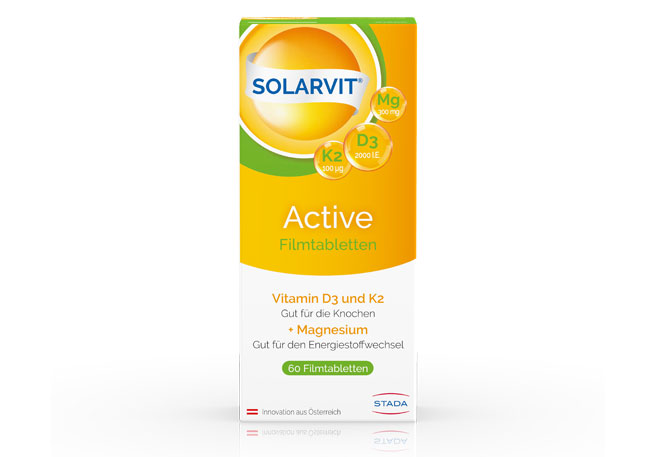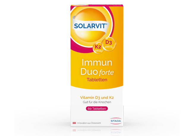 Ca-D3-STADA-Filmtabletten mit Kalzium und dem knochenstabilisierenden Sonnenvitamin D3 wurden speziell zur Unterstützung bei Osteoporose entwickelt. Daneben bietet STADA mit der führenden Vitamin-D3-Marke SOLARVIT® ein breites Angebot an unterschiedlich dosierten Vitamin-D3-Mono-Präparaten sowie Kombinationsprodukte mit hoch bioverfügbarem Vitamin K2 (MK-7) und Kalzium an.